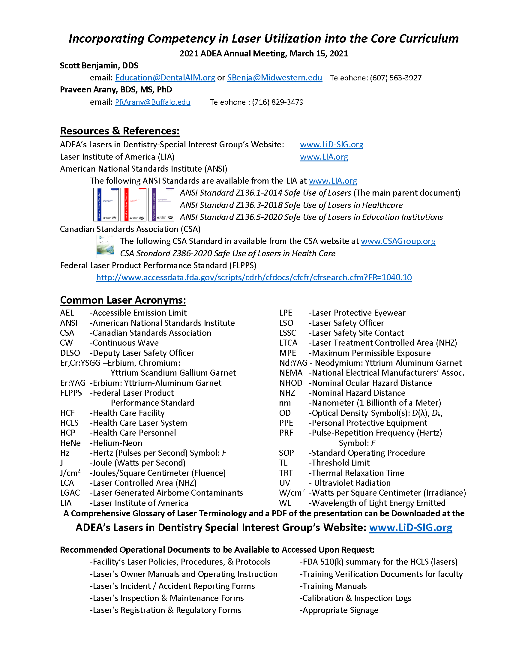 ANSI Z136.1(2014) American National Standard for the Safe Use of Lasers is the parent document of the laser safety standards, the Z136.1 and is the foundation of laser safety programs for health care, industry, military, research, development (labs), and higher education (universities). Z136.1